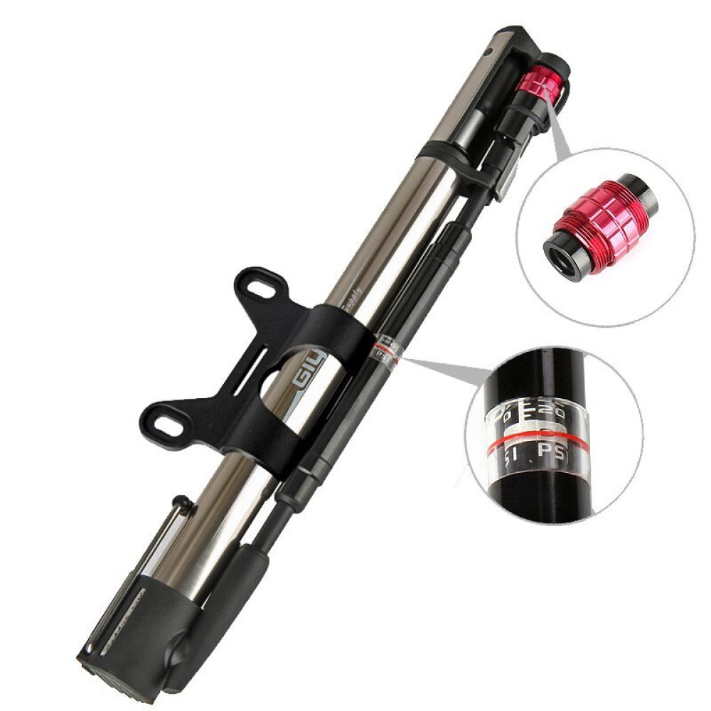 Насос GIYO GM-741, новая универсальная головка AV/FV (CLEVER TWIN VALVE) на гибком удлиненном шланге на шарнире и с манометром, Т-ручка, откидной ножной упор для максимального удобства, алюминиевый,  до 140PSI, крепеж к раме, 33см, Hi-Polish серый