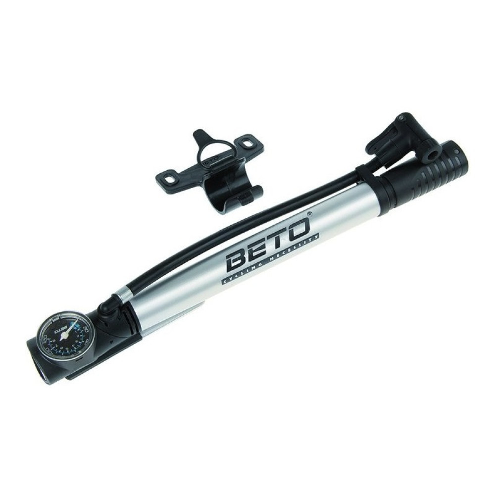 Насос велосипедный Beto оснащен универсальной головкой подходящей под авто и преста ниппель, имеет гибкий шланг на шарнире. Удобная Т-ручка и эргономичный откидной ножной упор для максимального удобства. Корпус алюминиевый. Манометр для контроля давления в шинах. Максимальное давление 8,5 бар, пластиковый крепеж к раме и резиновый хомут в комплекте.