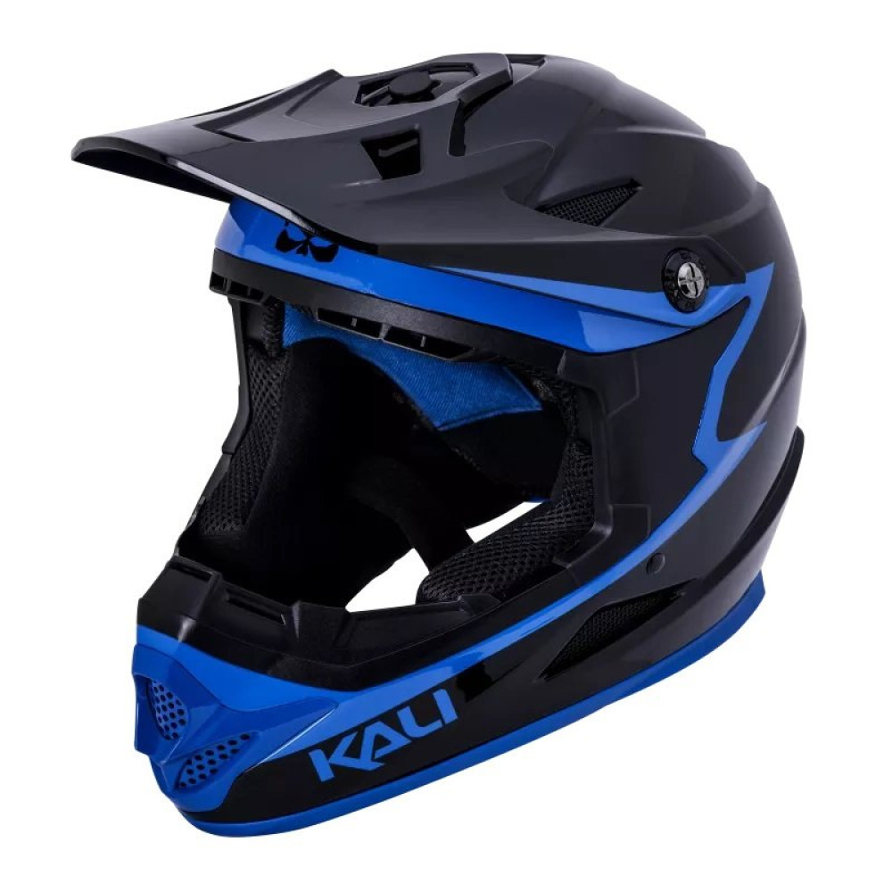 Шлем Full Face Kali Zoka, Черно-синий, 12 вентиляционных отверстий, регулируемый по высоте козырек, антибактериальный моющийся внутренник, Zoka легкий, стильный, шлем для экстримальных дисциплин Downhill, Dirt, BMX и др. 980гр,Сертификаты безопастности EN 1078, CPSC.