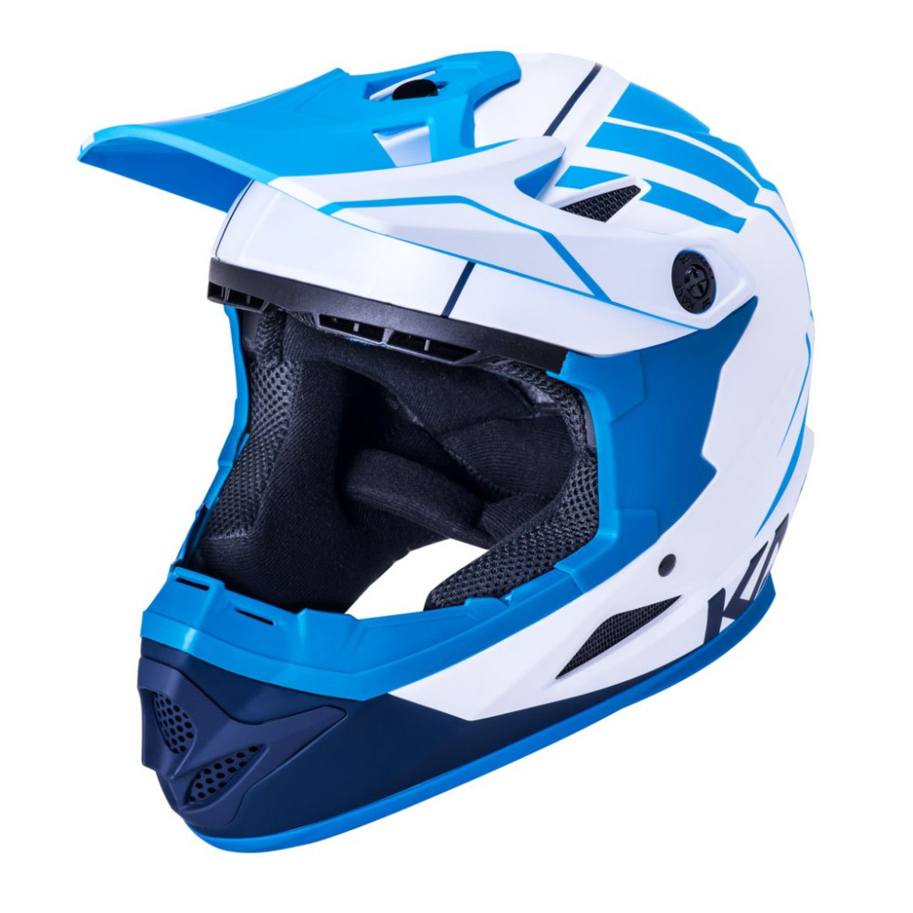 Шлем Full Face Kali Zoka, бело-синий-голубой , 12 вентиляционных отверстий, регулируемый по высоте козырек, антибактериальный моющийся внутренник, Zoka легкий, стильный, шлем для экстримальных дисциплин Downhill, Dirt, BMX и др. 980гр,Сертификаты безопастности EN 1078, CPSC.