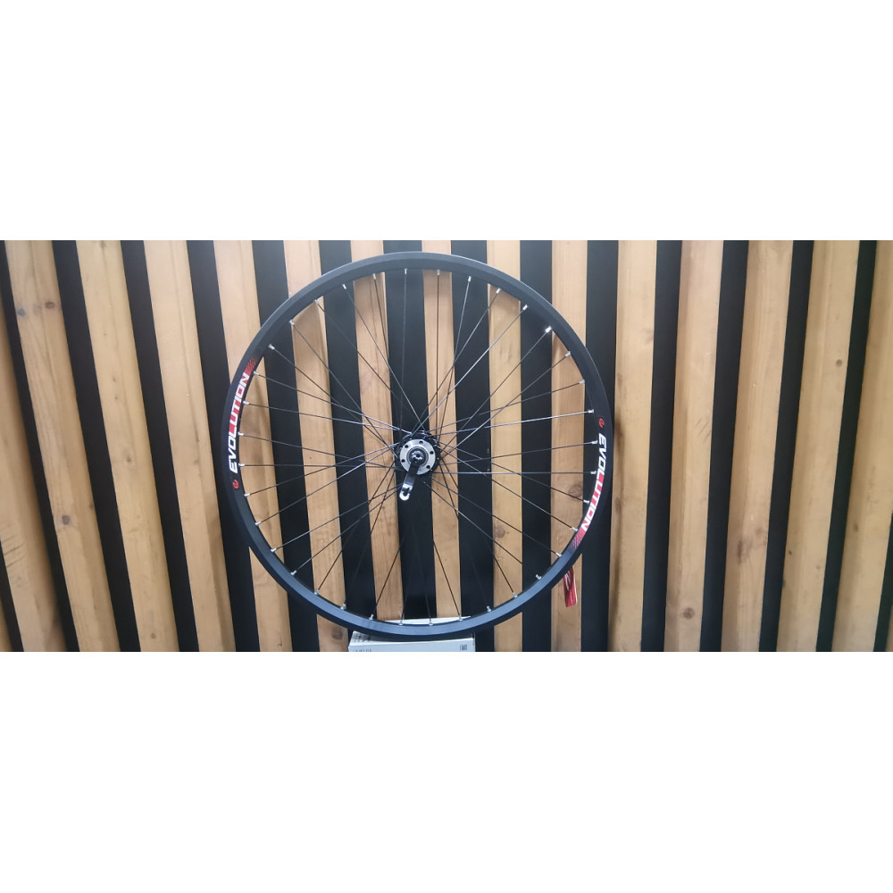 Переднее колесо велосипеда 27,5 дюймов собрано на алюминиевом ободе Evolution и втулке Shunfeng. Обод Evolution j19 имеет двойную стенку и 36 отверстий для спиц. Поверхность обода фрезерованная, что дополнительно улучшает его прочность и надежность так же на нём есть индикатор износа, который помогает отслеживать степень износа обода при установке ободных тормозов. Обод пистонированный что так же сильно влияет на крепкость колеса. Размеры обода составляют 584х19/27х21 мм, что обеспечивает отличное соотношение между жесткостью и весом. Обод имеет отверстие под автониппель, а его черное покрытие делает его более привлекательным.