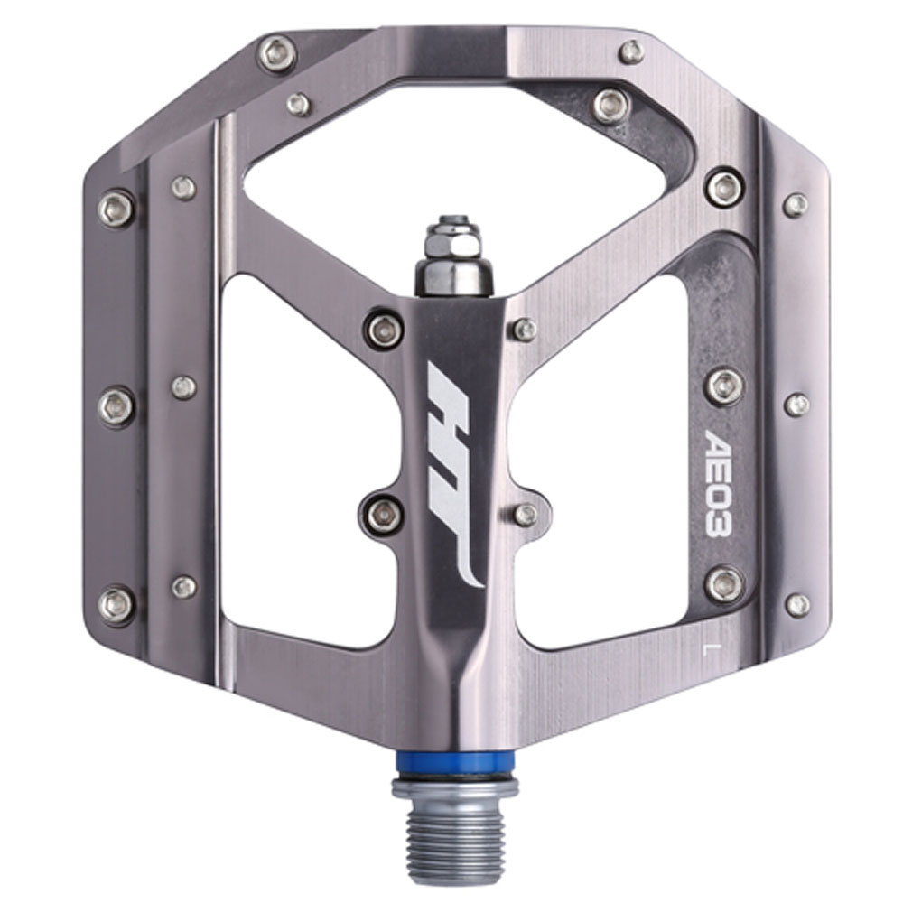 Педали HT AE03 созданы для ценителей максимальной надёжности и комфорта. За счет применения технологии EVO — эти педали станут для вас простыми и удобными в обсуживании. Они не требуют тщательного ухода, не прихотливы к грязи, а специально обработанный алюминий на станках с ЧПУ препятствует коррозии. Всего 11 мм высоты профиля заметно снижают центр тяжести педали, что положительным образом сказывается на управляемости. А алюминиевая платформа, имеющая 10 сменных шипов на одну сторону, достаточно прочна, для того что бы выдержать удары камней, неизбежно возникающие во время катания по сложным участкам трасс. Отличный вариант для тех, кто выжимает все соки из своего велосипеда.