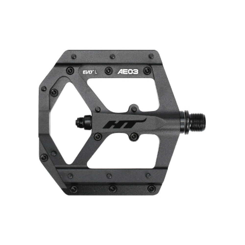 Педали HT AE03 созданы для ценителей максимальной надёжности и комфорта. За счет применения технологии EVO — эти педали станут для вас простыми и удобными в обсуживании. Они не требуют тщательного ухода, не прихотливы к грязи, а специально обработанный алюминий на станках с ЧПУ препятствует коррозии. Всего 11 мм высоты профиля заметно снижают центр тяжести педали, что положительным образом сказывается на управляемости. А алюминиевая платформа, имеющая 10  сменных шипов на одну сторону, достаточно прочна, для того что бы выдержать удары камней, неизбежно возникающие во время катания по сложным участкам трасс. Отличный вариант для тех, кто выжимает все соки из своего велосипеда.