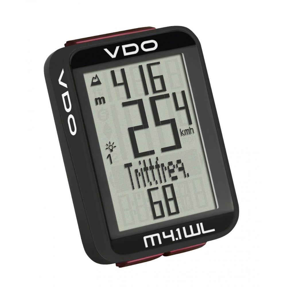 Велокомпьютер VDO M4.1WL беспроводной, 17 функций велокомпьютера + 17 функций альтиметра, сохранение данных при замене батареи, влагозащитный корпус, четырёхструнный дисплей увеличенного размера c крупными символами, датчик температуры окружающего воздуха, индикатор разряда батареи, подсветка дисплея, черный Количество функций - 24 Текущая скорость ания) Расстояние поездки Время поездки Средняя скорость Максимальная скорость Показатель отрезка пути (ручной секундомер, чтобы зарегистрировать время поездки на нужном отрезке) Показатель расстояния отрезка пути (регистрирует расстояние на нужном отрезке) Счетчик дорожный справочник, 2-й программируемый счетчик отключений. Часы Текущая температура Абсолютный пробег велосипед 1 и 2 Абсолютный пробег Абсолютное время поездок велосипед 1 и 2 Абсолютное время поездок Сравнение текущей и средней скорости