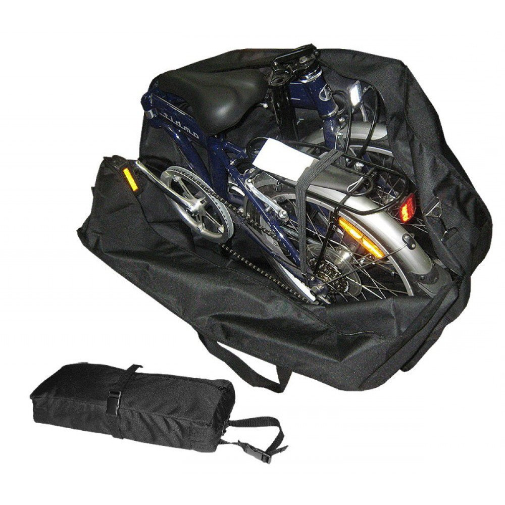 Чехол для транспортировки, хранения складного велосипеда с колёсами 24" дюйма. Имеет ручки и съемный плечевой ремень для переноски. Компактно складывается в наружный карман на фасаде. В упакованном виде удобно крепится на багажнике велосипеда с помощью двух пряжек.