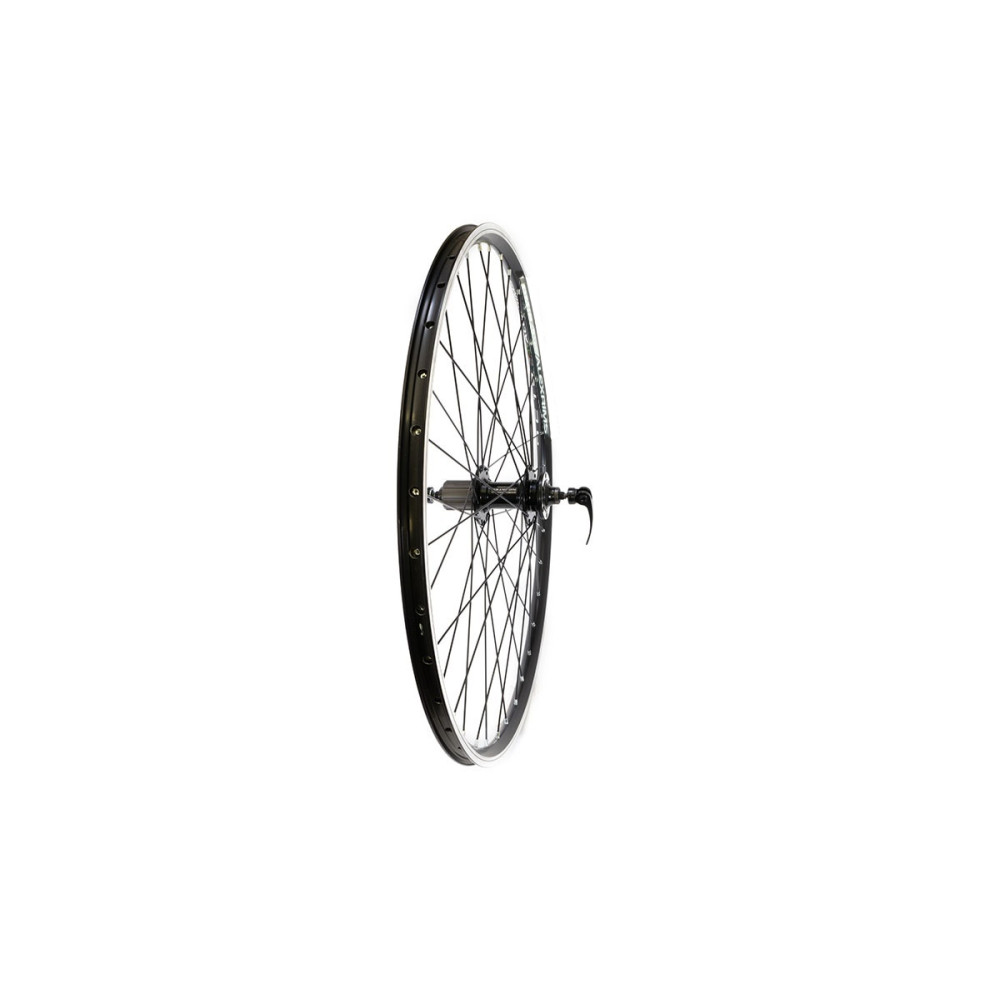 Заднее колесо велосипеда 27,5 дюймов собрано на алюминиевом ободе Alexrims DM-18 и втулке Novatec D762TSBT. Обод Alexrims DM-18 имеет двойную стенку и 36 отверстий для спиц. Поверхность обода фрезерованная, что дополнительно улучшает его прочность и надежность так же на нём есть индикатор износа, который помогает отслеживать степень износа обода при установке ободных тормозов. Размеры обода составляют 584х18/24х15,5 мм, что обеспечивает отличное соотношение между жесткостью и весом. Обод имеет отверстие под спортниппель, а его черное покрытие делает его более привлекательным.