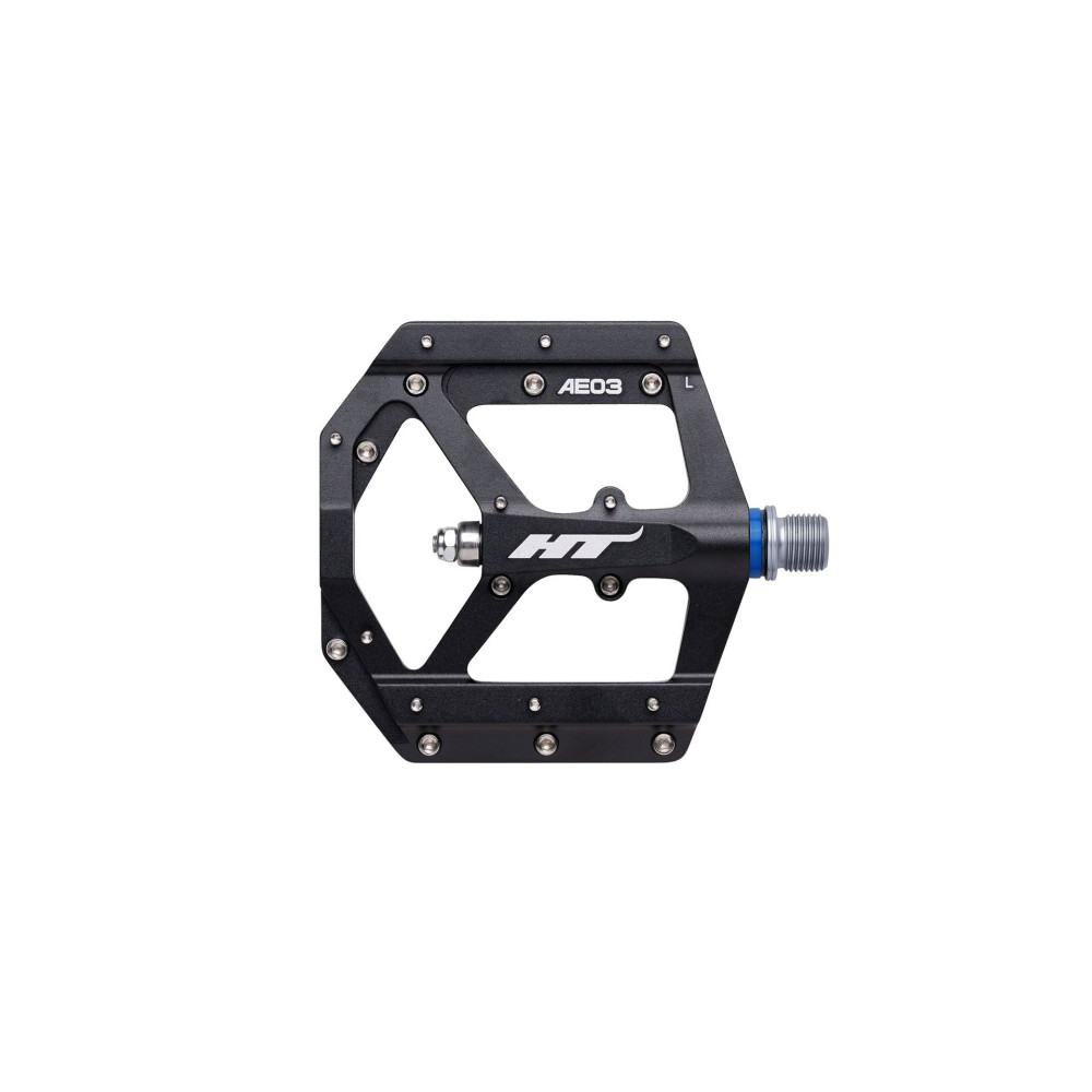 Педали HT AE03 созданы для ценителей максимальной надёжности и комфорта. За счет применения технологии EVO — эти педали станут для вас простыми и удобными в обсуживании. Они не требуют тщательного ухода, не прихотливы к грязи, а специально обработанный алюминий на станках с ЧПУ препятствует коррозии. Всего 11 мм высоты профиля заметно снижают центр тяжести педали, что положительным образом сказывается на управляемости. А алюминиевая платформа, имеющая 10  сменных шипов на одну сторону, достаточно прочна, для того что бы выдержать удары камней, неизбежно возникающие во время катания по сложным участкам трасс. Отличный вариант для тех, кто выжимает все соки из своего велосипеда.