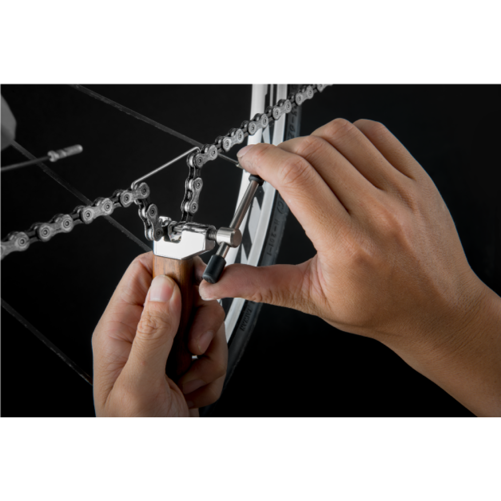 Новейшая легкая выжимка цепи цепи от Birzman премиум-класса c эргономичной рукояткой. Совместимость с цепями на 8-12 скоростей.  Выжимка оснащена технологией от Birzman "Innovative Spring System" или инновационный пружинный зажим, благодаря которому звенья различных цепей одинаково хорошо фиксируются, а пин выжимается легко и аккуратно. Рукоятка выполнена из полированного дерева.